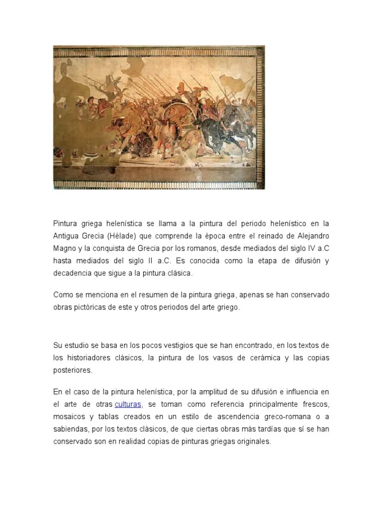 Lo que sí se han conservado son algunas tablas que provienen de egipto y … El arte minoano es extraordinario en cuanto al sentido del movimiento y el … Al ser un material poco perdurable, esta es la principal razón por la que en la actualidad no existen pinturas de la época que aún se conserven... La pintura romana se confunden con los de su escultura y de tal modo se hallan en el arte helenista que aun los ejemplares que de ella se conservan, sobre todo, los mejores, se atribuyen hoy a mano griega si bien la escuela llegara por fin a romanizarse.