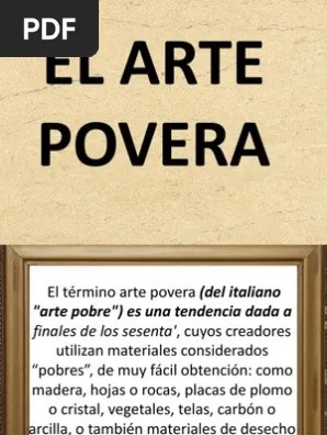 El término arte povera (del italiano arte pobre) es una tendencia dada a conocer a finales de la década de 1960, cuyos creadores utilizan materiales considerados pobres, de muy fácil obtención, como madera, hojas o rocas, vajilla, placas de plomo o cristal, vegetales, telas, carbón o arcilla, o también materiales de desecho y, por lo tanto, carecían de valor. La expresión arte povera se traduce al español como arte pobre. O objetivo é provocar a reflexão através do manuseio do material e a observação de suas qualidades específicas. El arte povera es considerado como uno de los principales movimientos de vanguardia que tuvo una influencia de suma importancia en europa a finales de los años 60. Fue un tipo de arte que utilizó materiales considerados como comunes antes de que se desarrollara la era industrial, de manera tal que sus representantes utilizaron materias primas como rocas, tierra, papel y mecates.